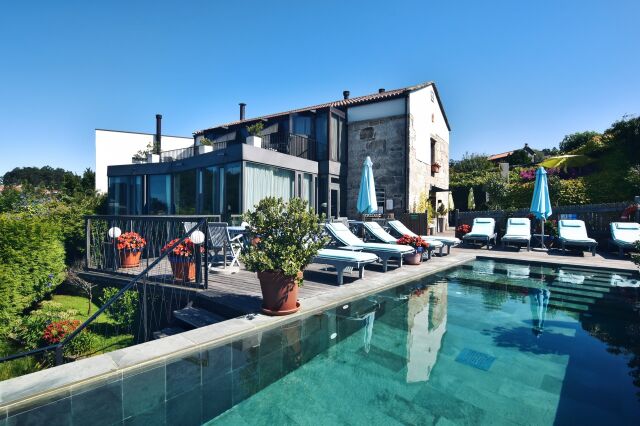 Hotel rústico en Galicia con vistas a viñedos de Rías Baixas, combina elegancia y gastronomía de temporada, ideal para disfrutar todo el año